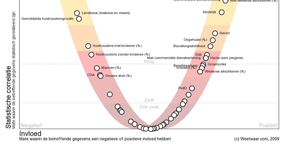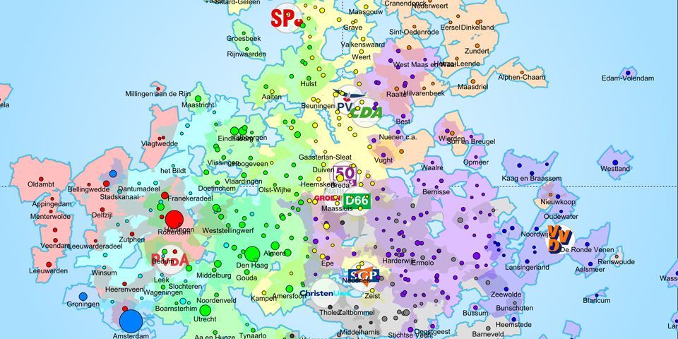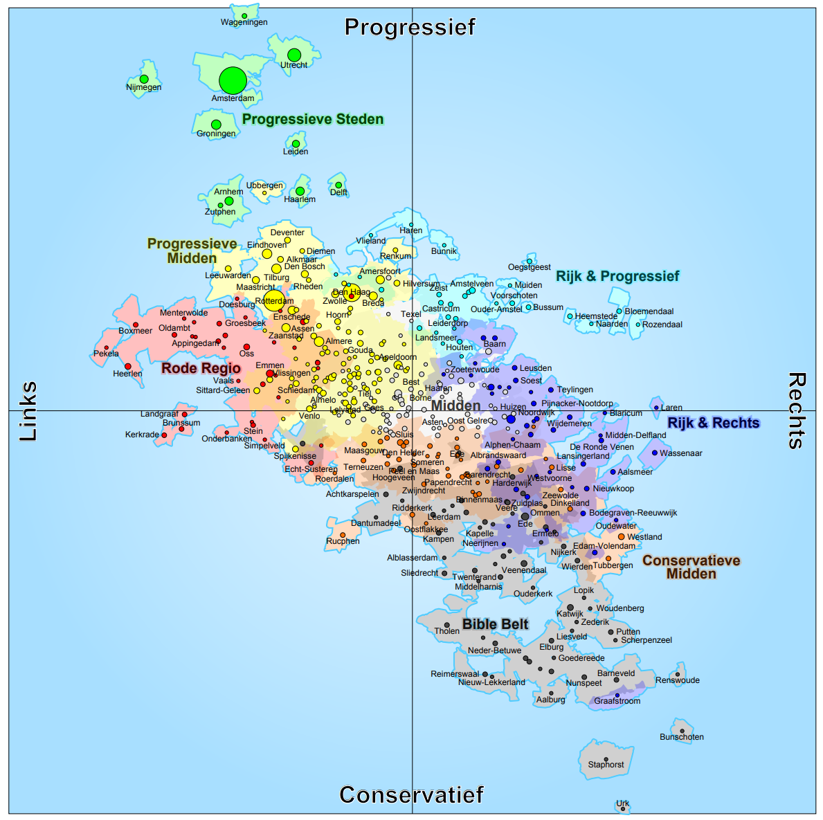 De kaart van Nederland, maar dan anders. De Politieke Landkaart is een weergave van de politieke oriëntatie van alle Nederlandse gemeenten, van Links naar Rechts, van Conservatief tot Progressief.