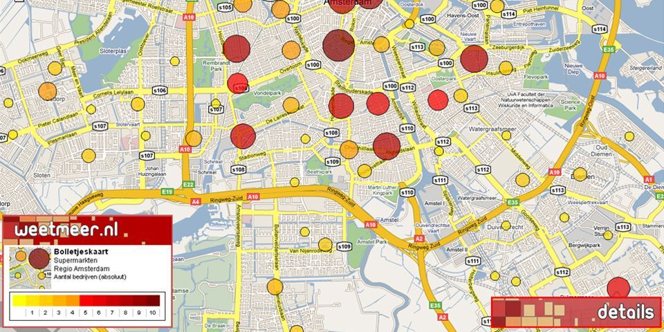 Inzicht in de bedrijvigheid in Amsterdam, waarbij het aantal bedrijven per branche in kaart gebracht kan worden. Als heatmap of als overzicht van aantal bedrijven per postcodegebied.