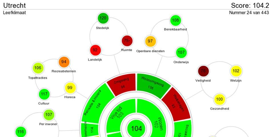 Visualisatie van veel verschillende aspecten van het leefklimaat van een gemeente, weergegeven in één diagram waarmee in één oogopslag de sterke en zwakke punten duidelijk zijn.