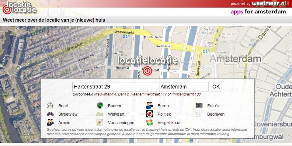 Inzending voor Apps for Amsterdam-competitie, waarmee alle informatie over een locatie in Amsterdam getoond wordt. Over de buurt, de buren, de politiek, de bodemgesteldheid, de voorzieningen, etc.