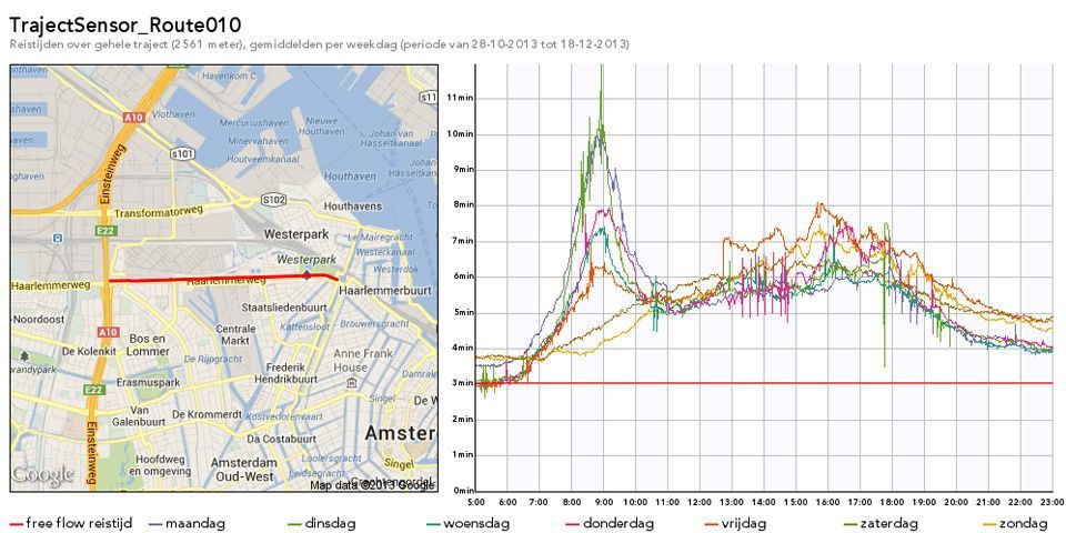 Reistijden van 170 belangrijke routes in Amsterdam zijn opgeslagen, geanalyseerd en weergegeven in duidelijke grafieken waarin de drukte per tijdstip van de weekdag direct inzichtelijk zijn.